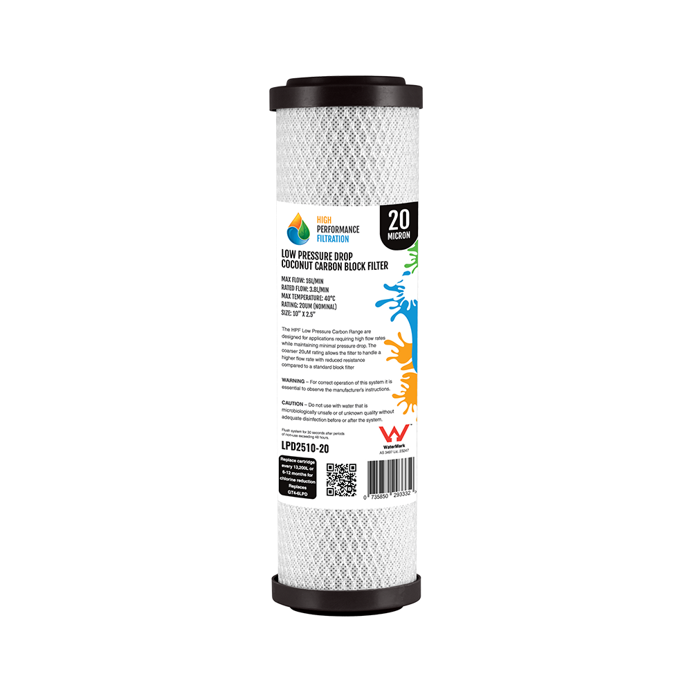 10” X 2.5” Low pressure drop carbon block replacmnet filter = low restriction